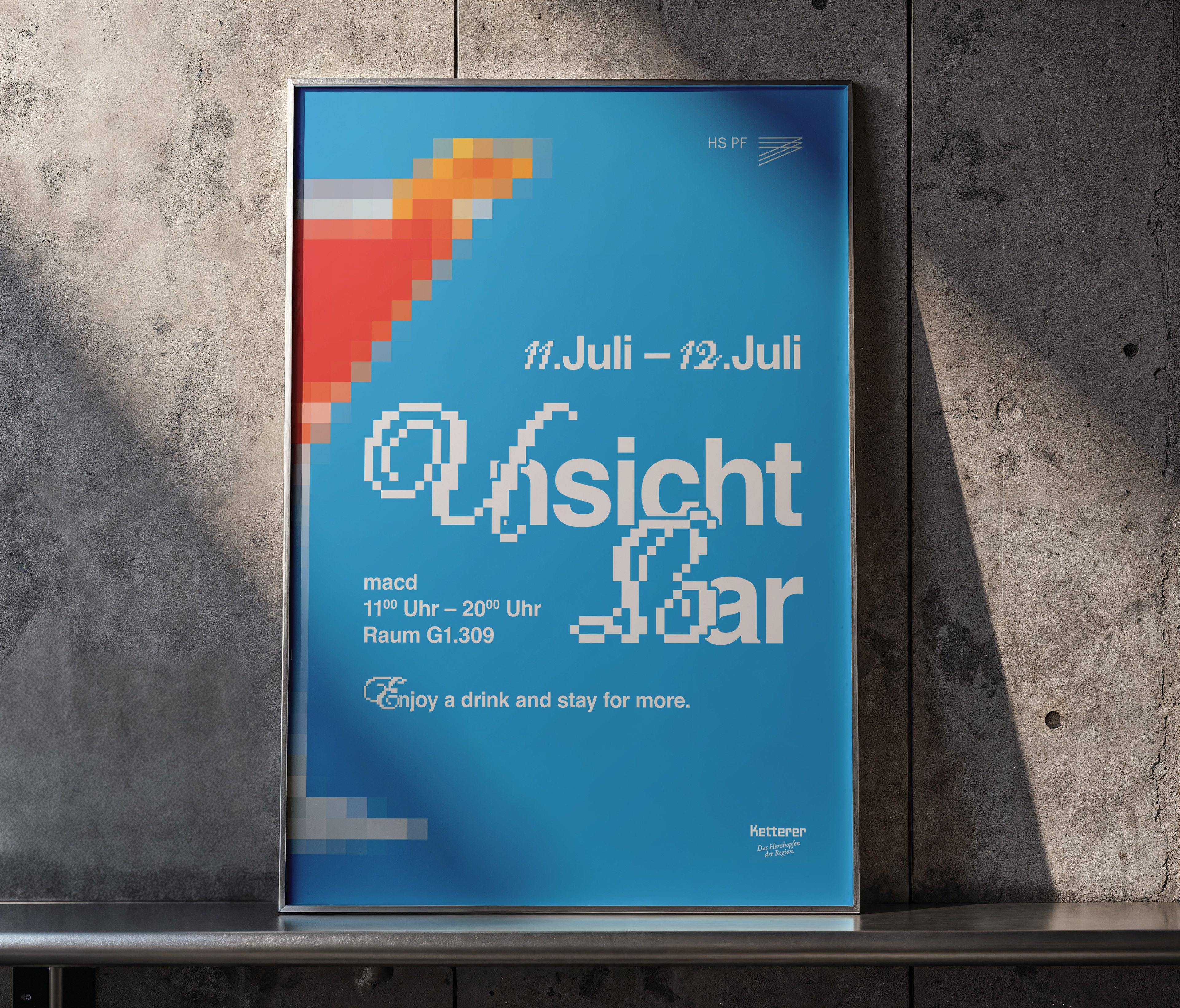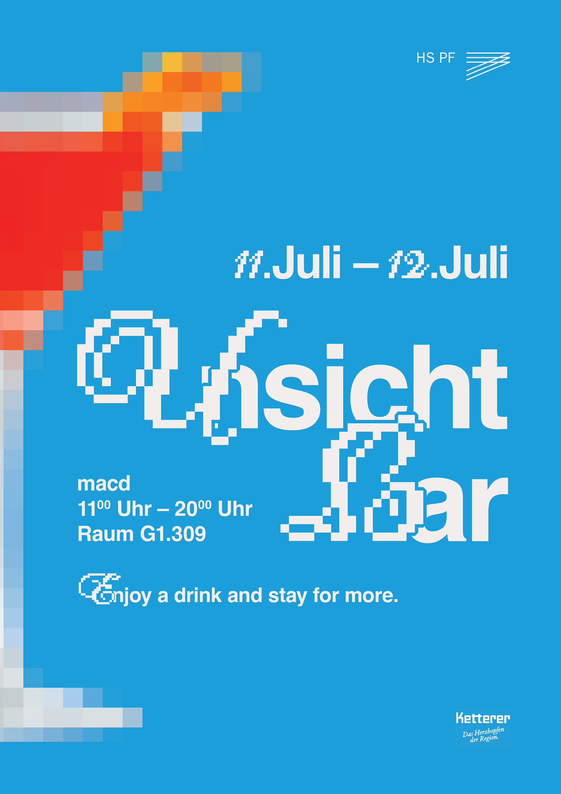 Dieses Plakat enstand im Rahmen der Werkschau des Masters (Studiengang Creative Direction) an der Hochschule Pforzheim und hat das Ziel die zugehörige Rauminstallation zu bewerben. Zusätzlich entstanden Bierdeckel, Sticker und Getränkekarten. // Das Corporate Image entstand in Zusammenarbeit mit Vanessa Cataldo, Theo Depluet und Sebastian Ertl.